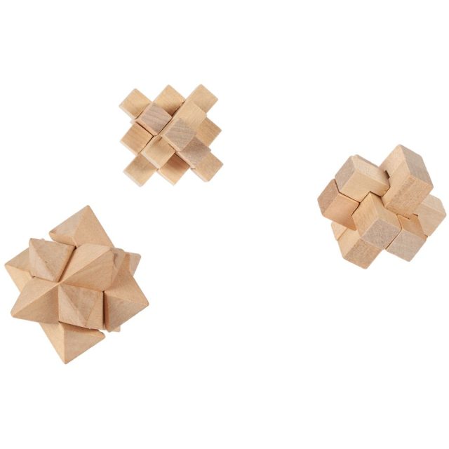В наборе 3 деревянных головоломки, инструкция, мешочек.