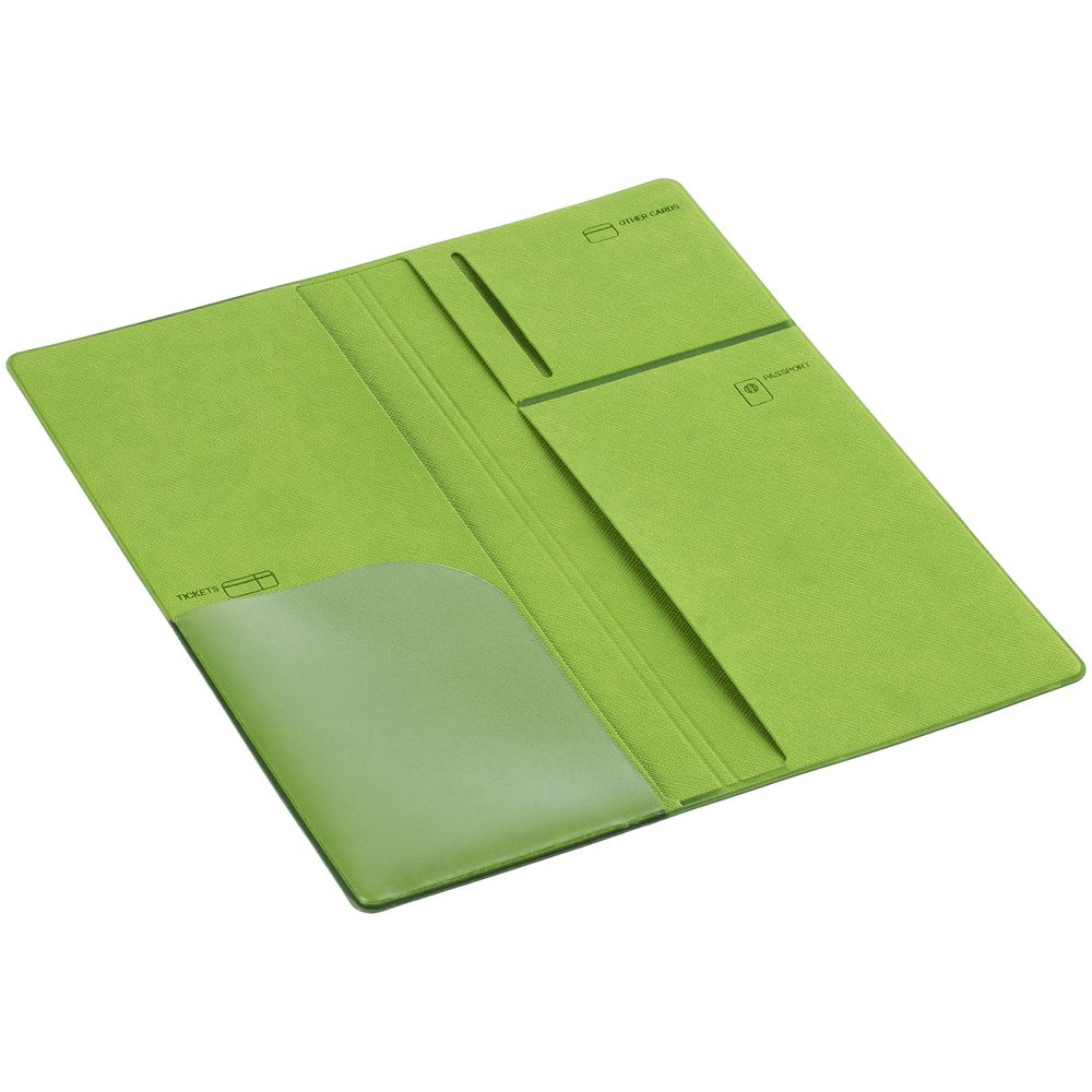 Органайзер из искусственного материала, имитирующего сафьяновую кожу, имеет 5 отделений: для билетов, паспорта, визиток или кредитных карт.