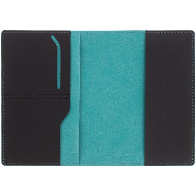 Обложка выполнена из материала Soft Touch Pearl, черный АА и срез обложки окрашен в цвет внутреннего материала Latte, бирюзовый II.