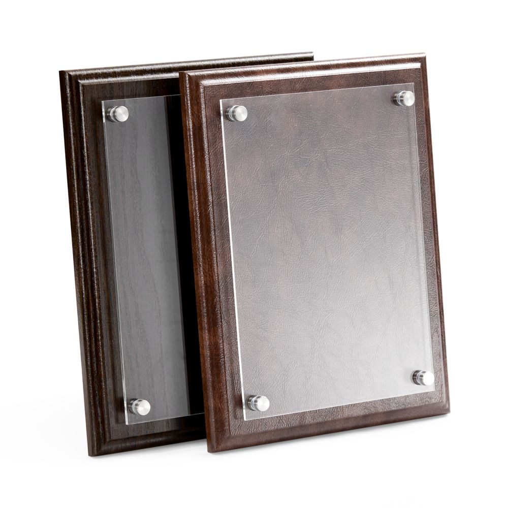 Классическая плакетка с имитирующей кожаную текстуру основой и акриловой вставкой — универсальный инструмент, чтобы рассказать о достижениях команды.