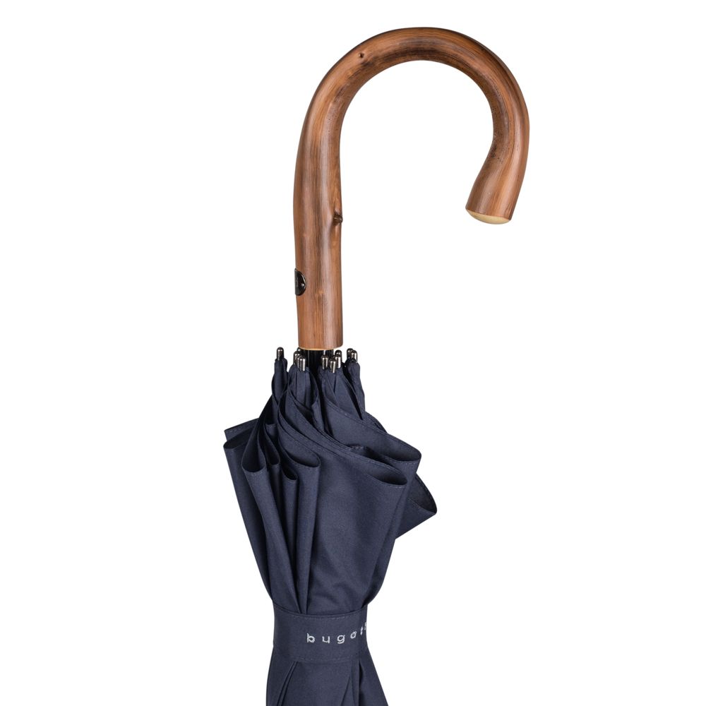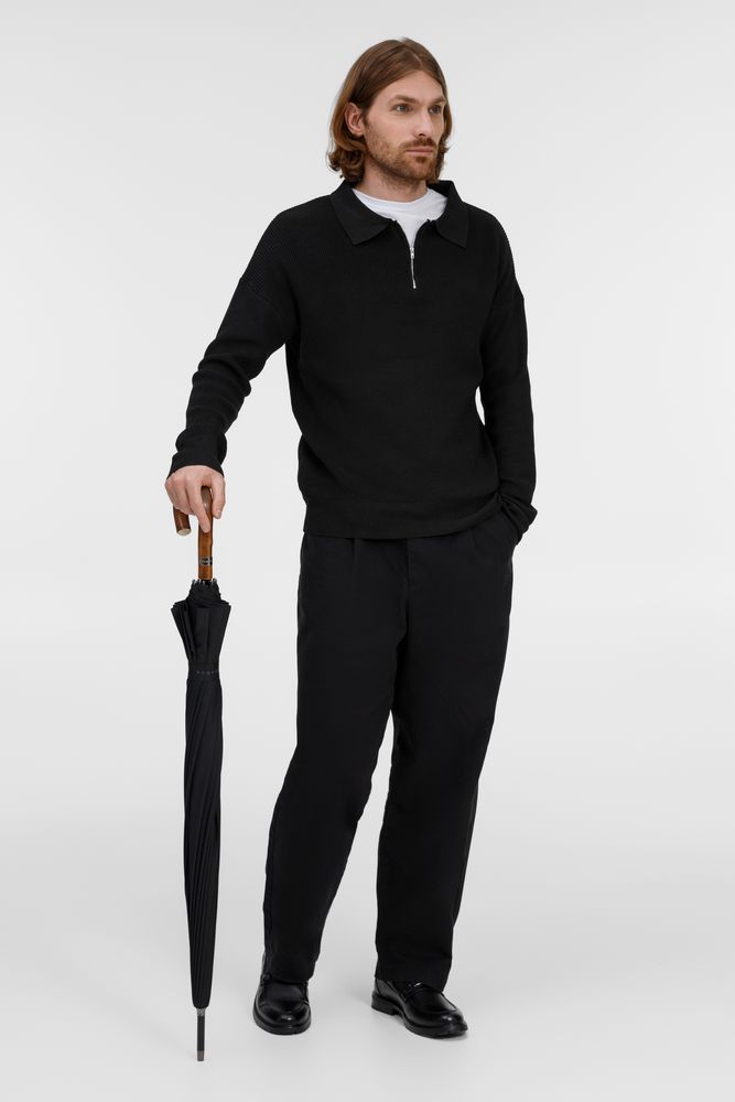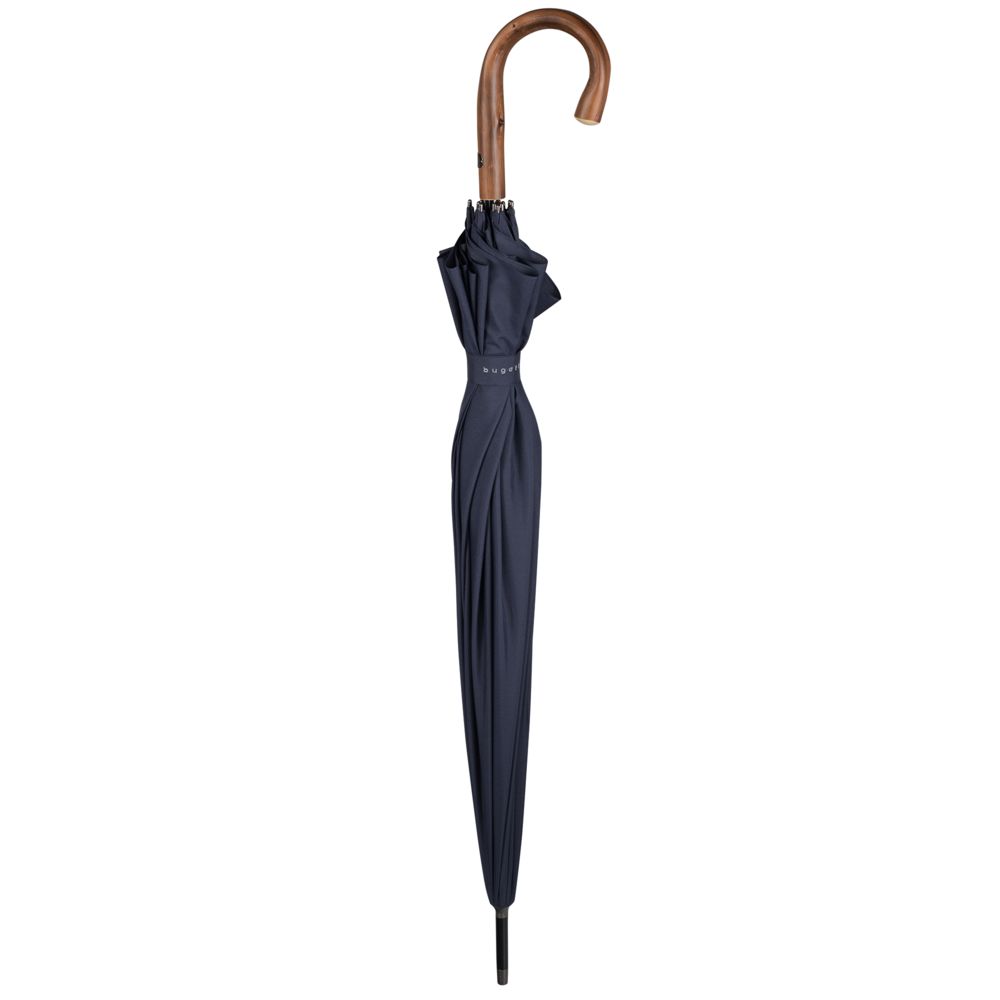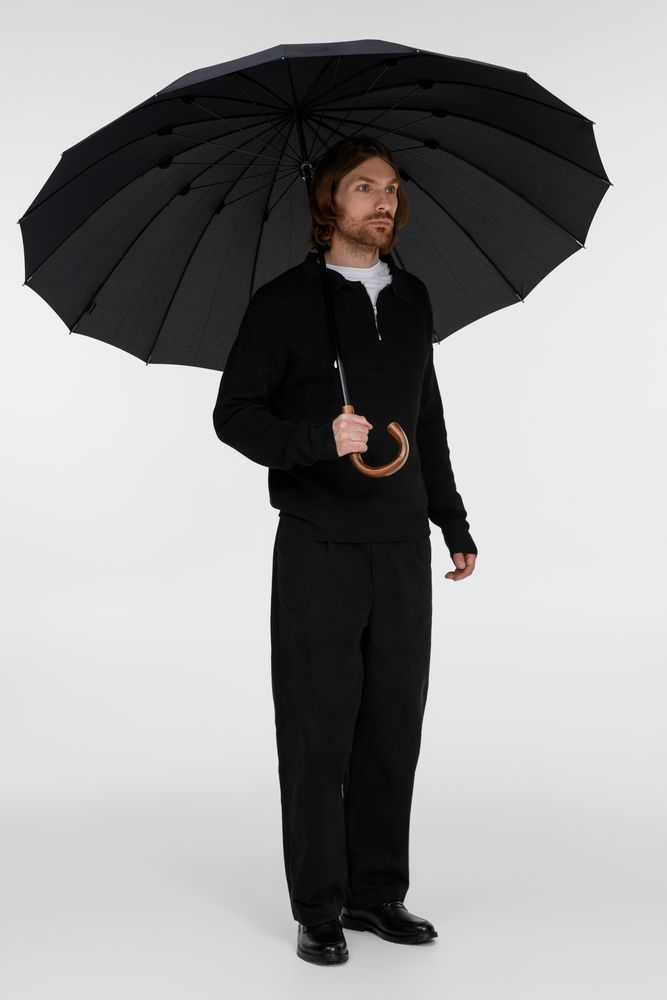 Солидный изысканный зонт с ручкой из дерева и 16 спицами. Большой купол легко укроет от дождя сразу двоих, а надежная конструкция выдержит даже сильный ветер.