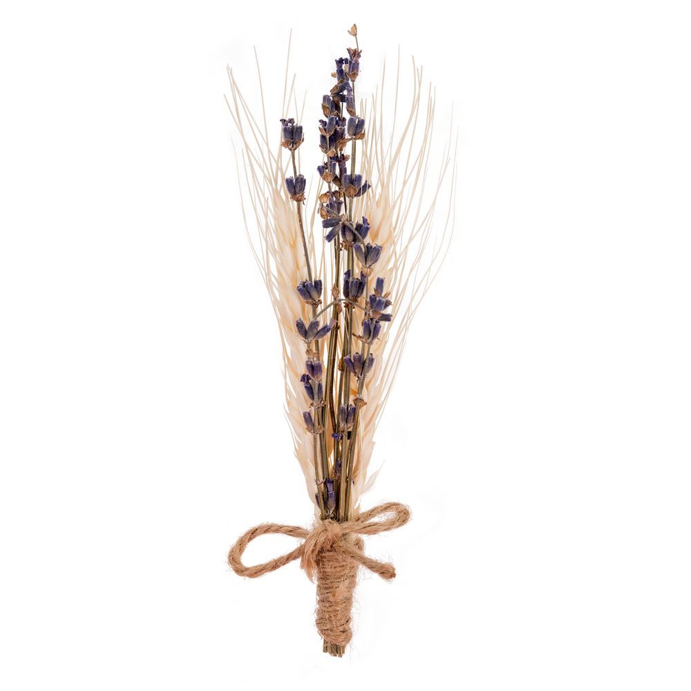 Декоративный букет из 2 колосков пшеницы и веточки лаванды перевязан джутовым шпагатом.