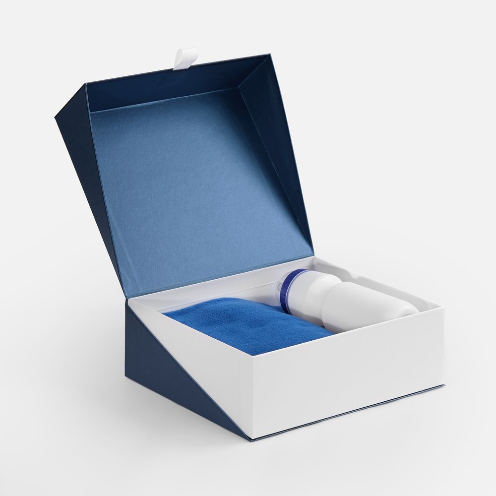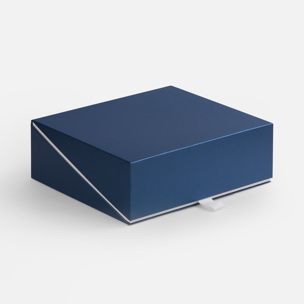 Коробка изготовлена из переплетного картона. Внутренний короб каширован мелованной бумагой с ламинацией, внешний корпус — лайнером из металлизированной бумаги Pearl Dream Blue, плотностью 135 г/м². Крышка фиксируется на магнит.