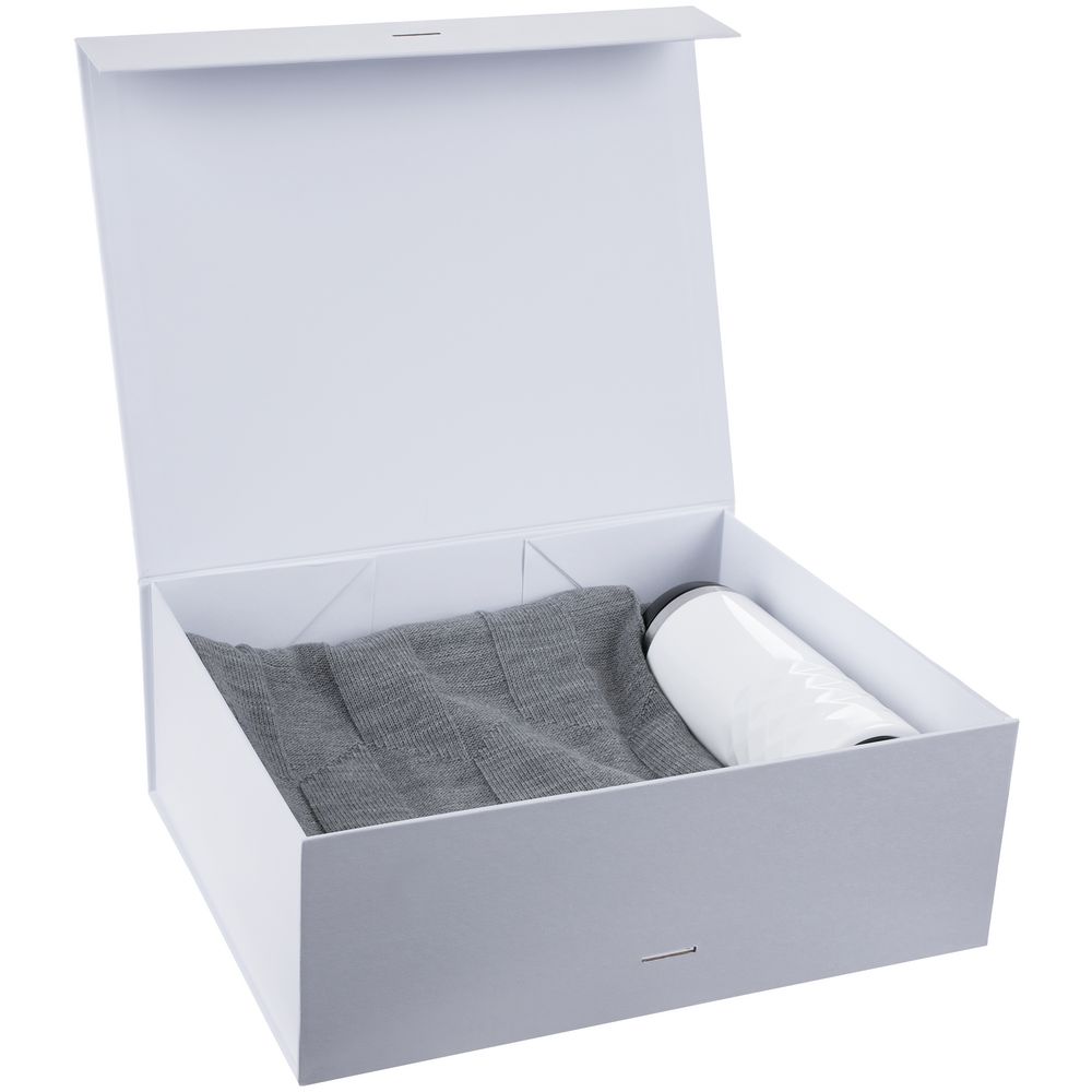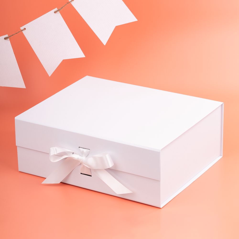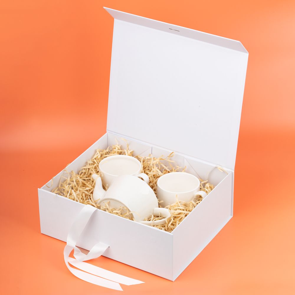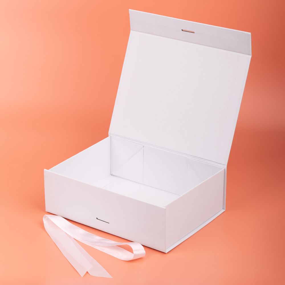 Коробка из переплетного картона, кашированного крафтовой бумагой. Крышка на двух магнитах дополнительно фиксируется репсовой лентой.Толщина картона 2 мм.