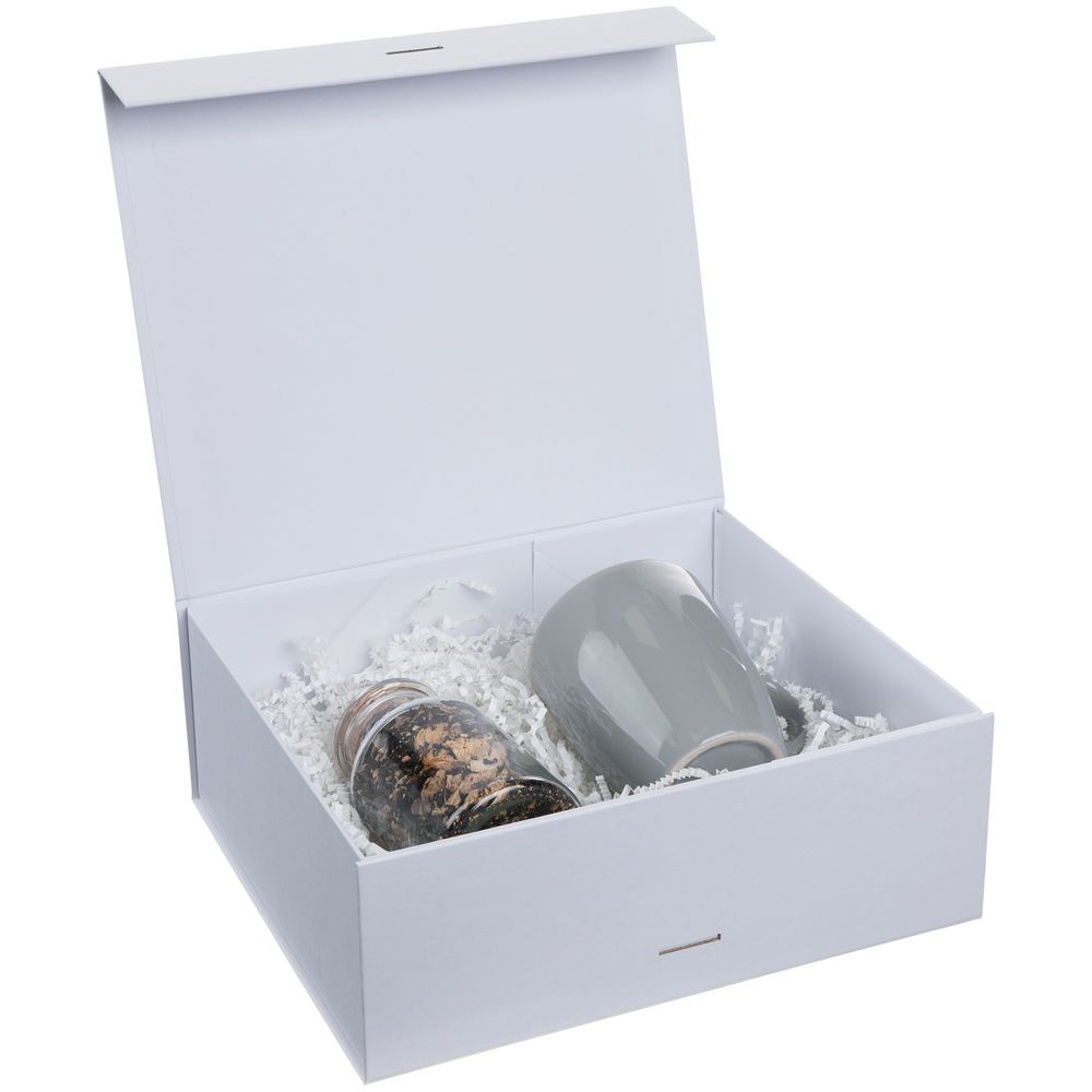 Коробка из переплетного картона, кашированного тонированной в массе крафтовой бумагой. Крышка на двух магнитах дополнительно фиксируется репсовой лентой.Толщина картона 2 мм.