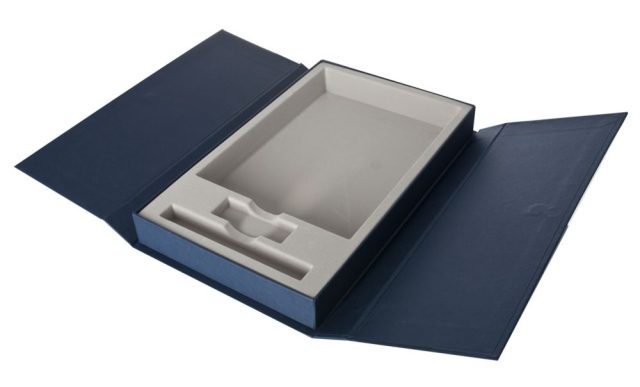 Коробка из переплетного картона 1,75 мм, кашированного бумагой Efalin Fine Linen, с двумя створками на магните и флокированным ложементом.