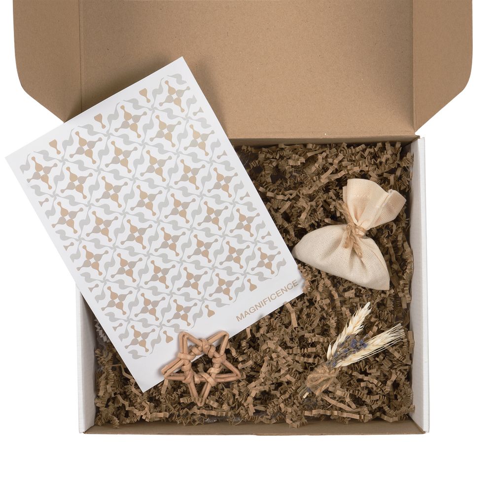 Коробка с наполнителем, шубером, открыткой и милыми украшениями Adorno — готовое решение для упаковки личного и корпоративного подарка.