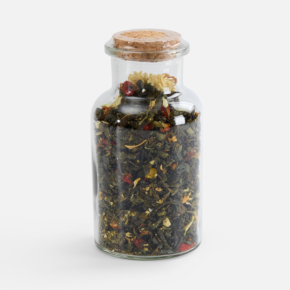 Насыщенный медовый десерт с хрустящими орехами, яркими цукатами и полезными семенами составляет идеальную партию зеленому чаю особого купажа, в основе которого нежные листья зеленого чая в обрамлении сладковатых нот кэроба и сушеного яблока. Ягоды годжи и сублимированная клубника дарят витаминную свежесть, а цветки хризантемы и апельсинового дерева — тонкий цветочный аромат.