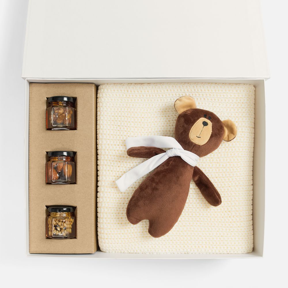 Милый мишка в шарфике с целой коллекцией разнообразного ароматного меда идеально дополняет основной, более практичный подарок — объемный шарф из толстой пряжи, который впишется в любой зимний образ.