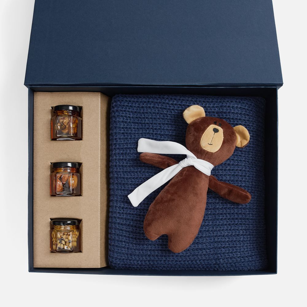 Милый мишка в шарфике с целой коллекцией разнообразного ароматного меда идеально дополняет основной, более практичный подарок — объемный шарф из толстой пряжи, который впишется в любой зимний образ.