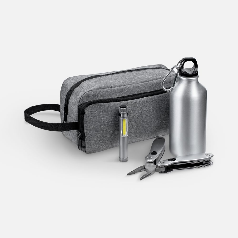 | Материал | мультитул, фонарик, бутылка — алюминий; несессер — полиэстер |