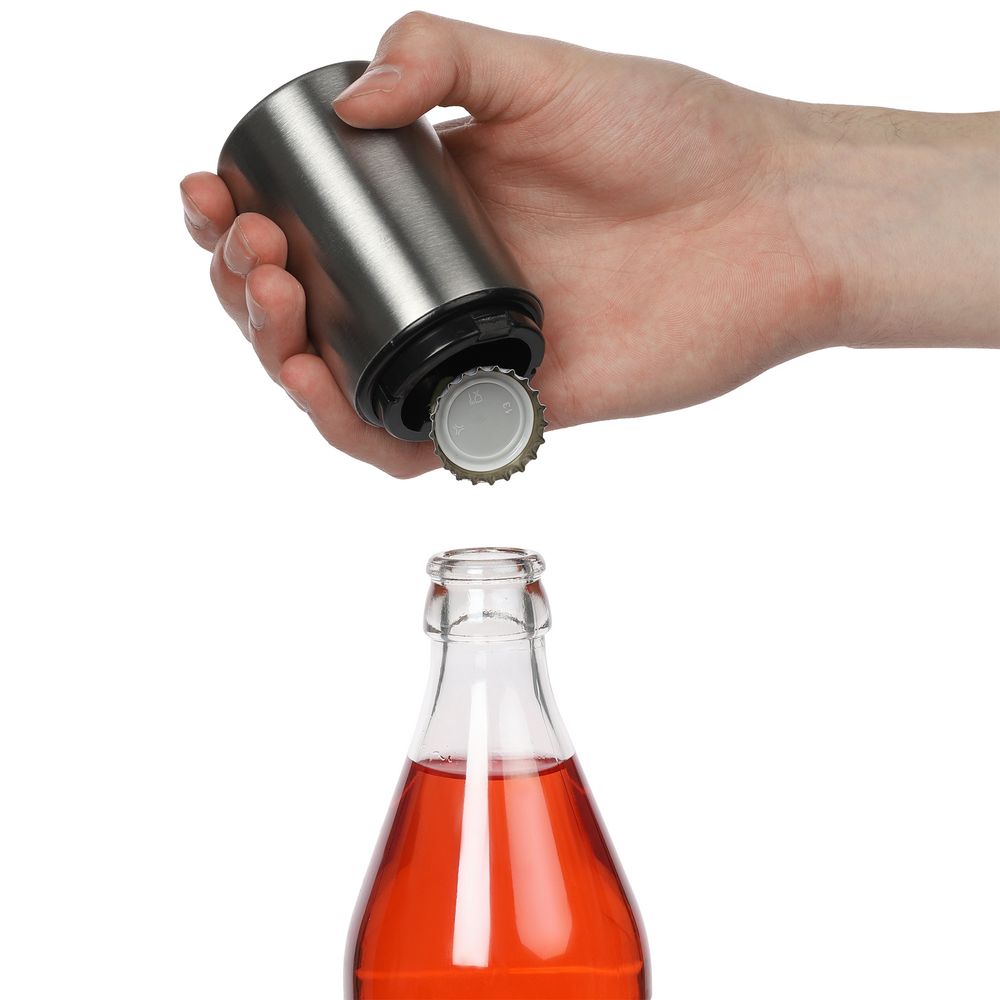 Наденьте открывашку на горлышко бутылки и надавите до щелчка. Снимите открывашку: металлическая пробка примагнитится и останется на ней.