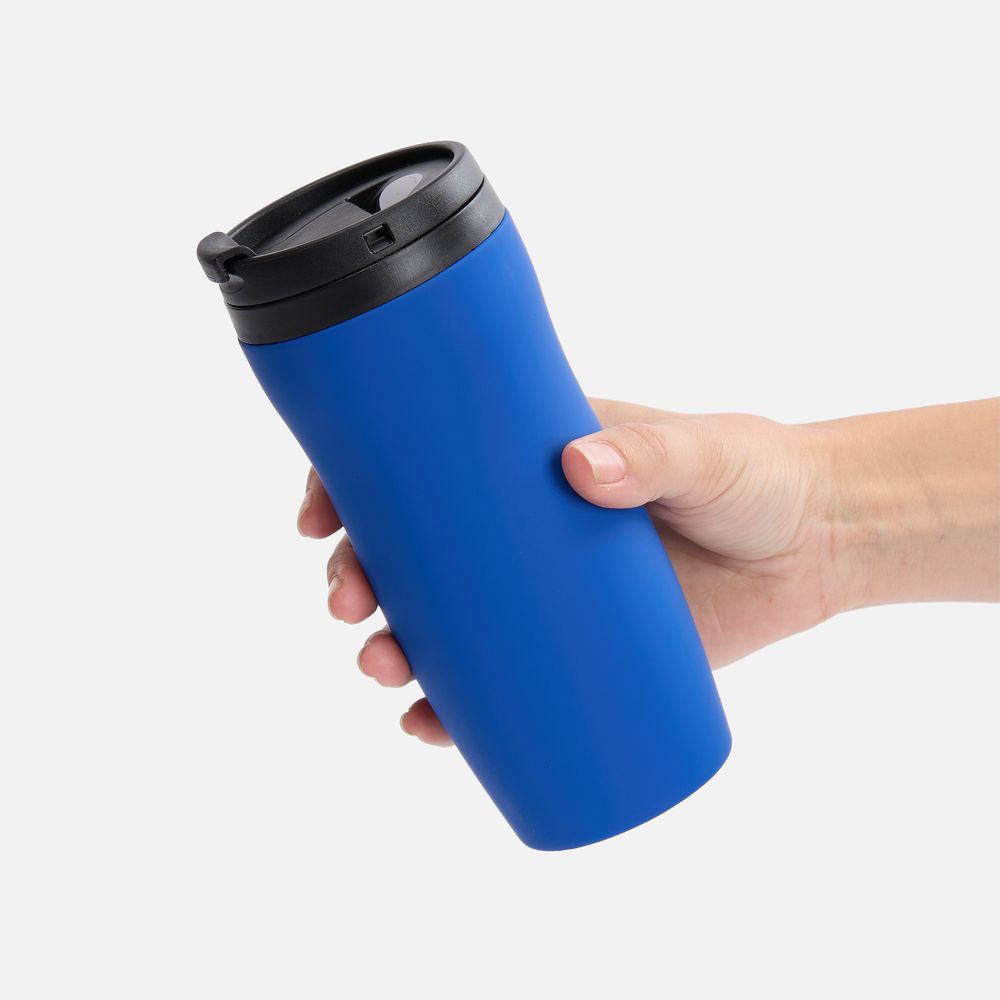 Двухслойная конструкция из нержавеющей стали снаружи и пищевого пластика внутри. Герметичная завинчивающаяся крышка с откидным клапаном для питья. Покрытие софт-тач. В отверстие в крышке можно вставить шнурок для удобного ношения стакана на руке. Шнурок в комплект не входит.