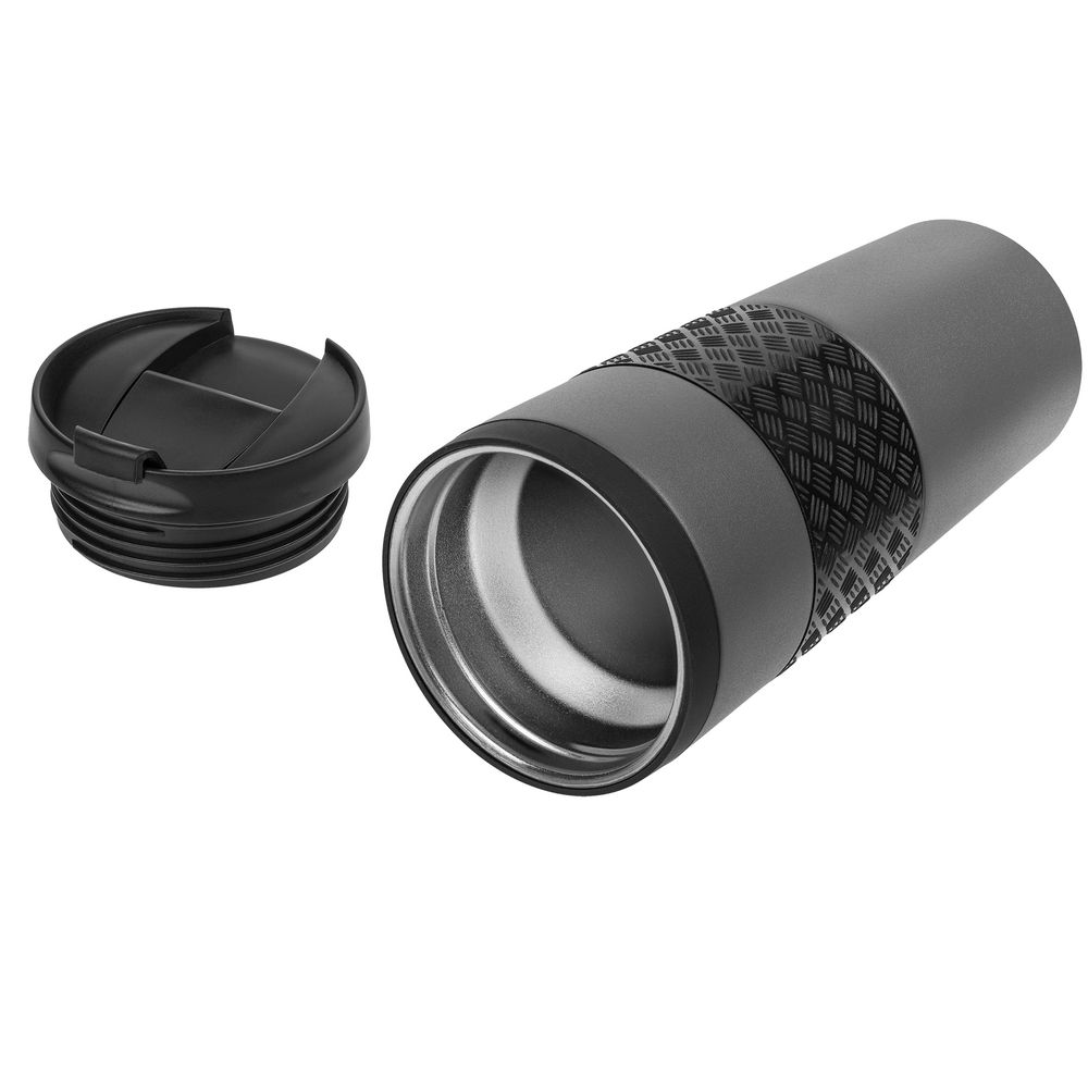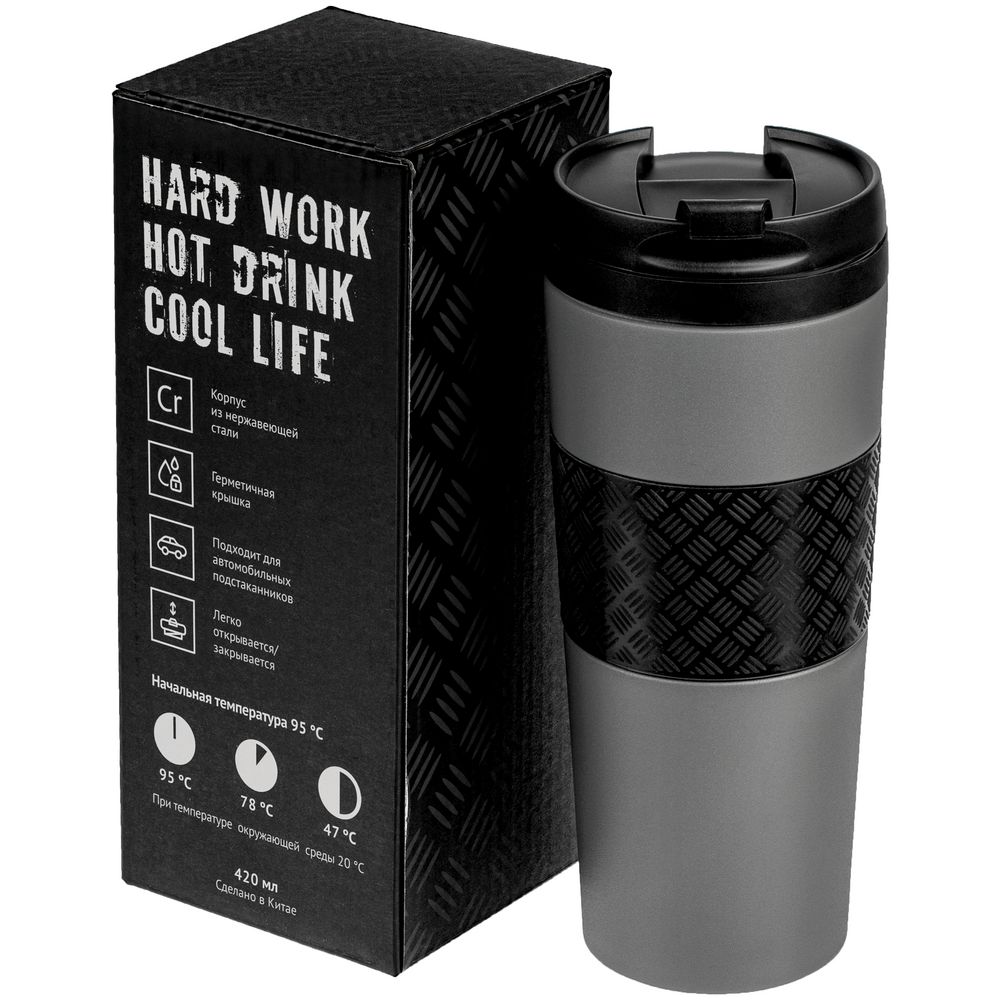 Двухслойная вакуумная конструкция из нержавеющей стали. Герметичная завинчивающаяся крышка с откидным клапаном. Стакан подходит для большинства автомобильных подстаканников.