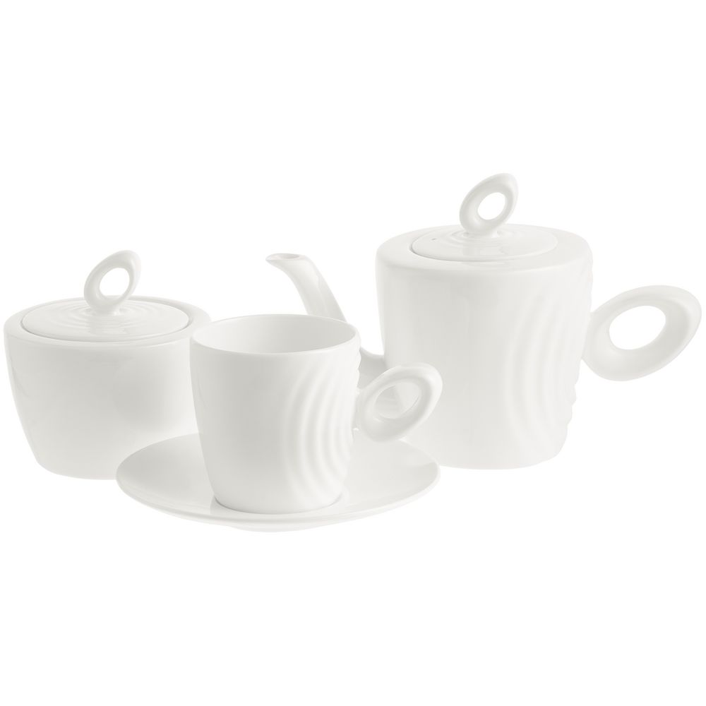 Форма сервиза создана в скульптурной технике: фарфор словно запечатлел сам момент движения. Необычная ручка предметов символизирует камень, от которого появляются завораживающие круги на воде — корпусе изделия.