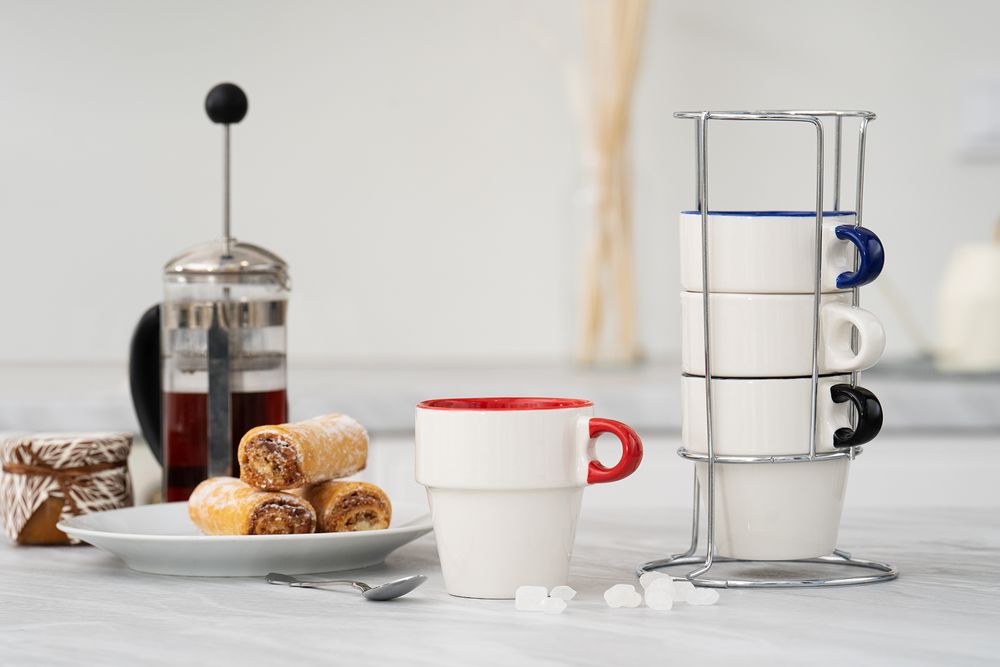 Вертикальное хранение кружек экономит место на кухне, а подставка собирает набор в единое целое. Набор Inset — красивое решение для компактной кухни.