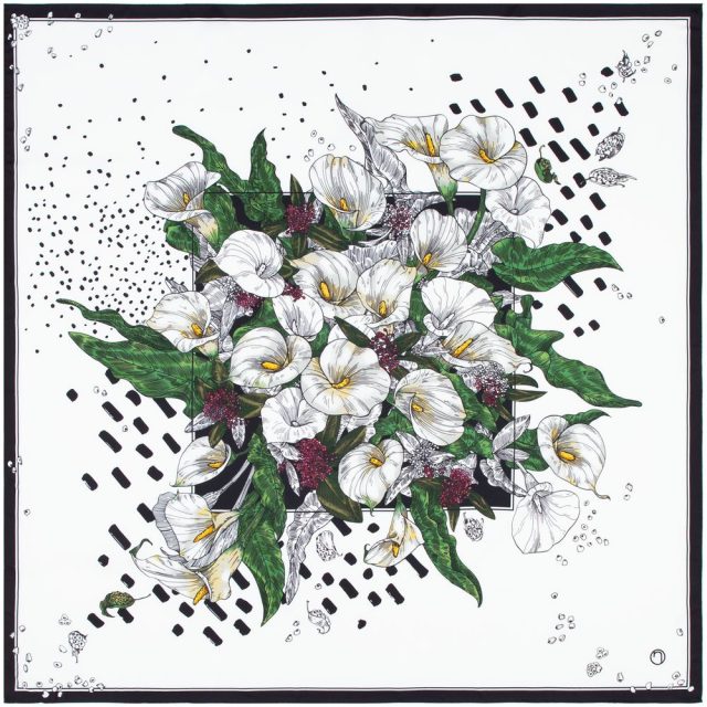 Шелковый платок с цветочным принтом открывает простор фантазии — его можно использовать как шарф, головной убор или декоративный элемент для верхней одежды и аксессуаров.