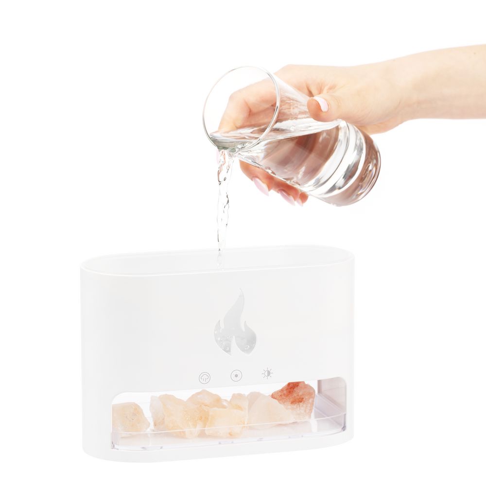 Благодаря оптическому эффекту пламя как будто вырывается из устройства, напоминающего настольный камин, а соль становится похожа на угли от прогоревших дров.