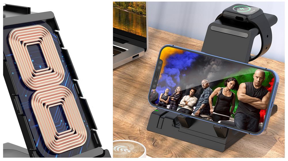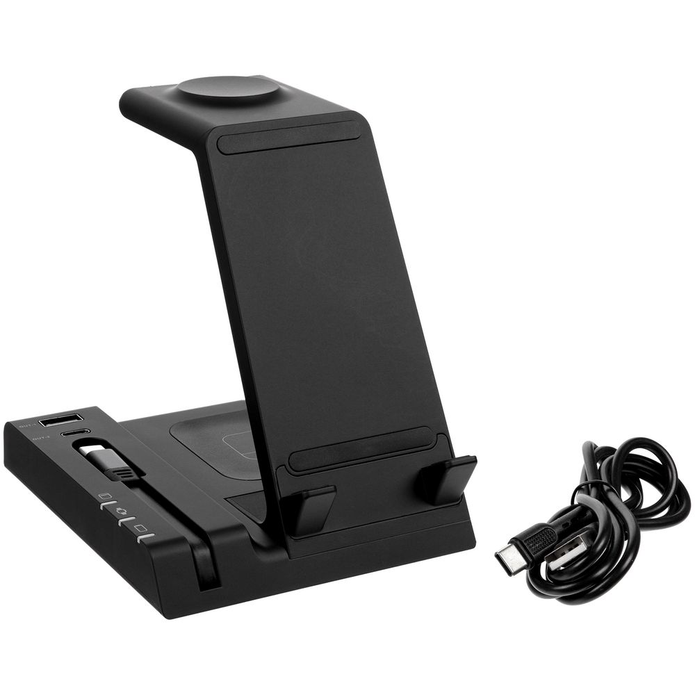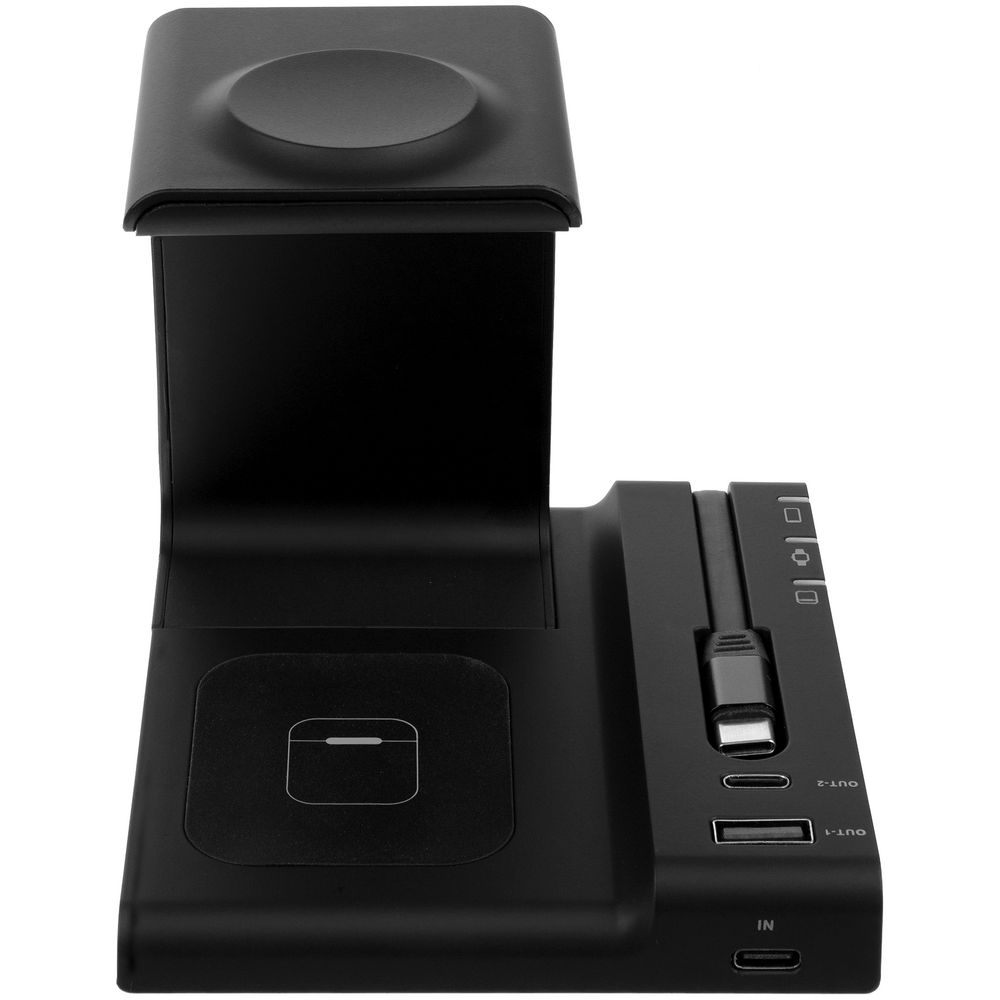 Зарядная станция Tres высшего уровня сложности позволяет заряжать до 5 гаджетов одновременно: телефон, часы Apple Watch 2–8, наушники с поддержкой протокола беспроводной зарядки Quick Charge и еще 2 устройства через кабели с разъемами USB-А и Type-C.