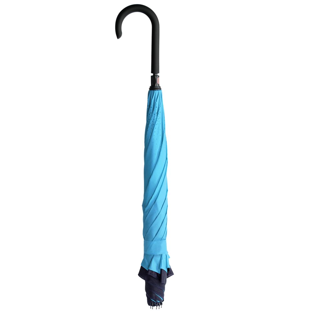 Это зонт-наоборот, зонт-наизнанку. Складываясь после дождя, он прячет мокрую поверхность в себя, а сухая остается снаружи. Для просушки его можно не только подвесить за ручку, как обычные зонты, но и поставить прямо на пол в полусложенном состоянии. Итог — мягкая щадящая просушка и минимум занятого мокрым зонтиком места.