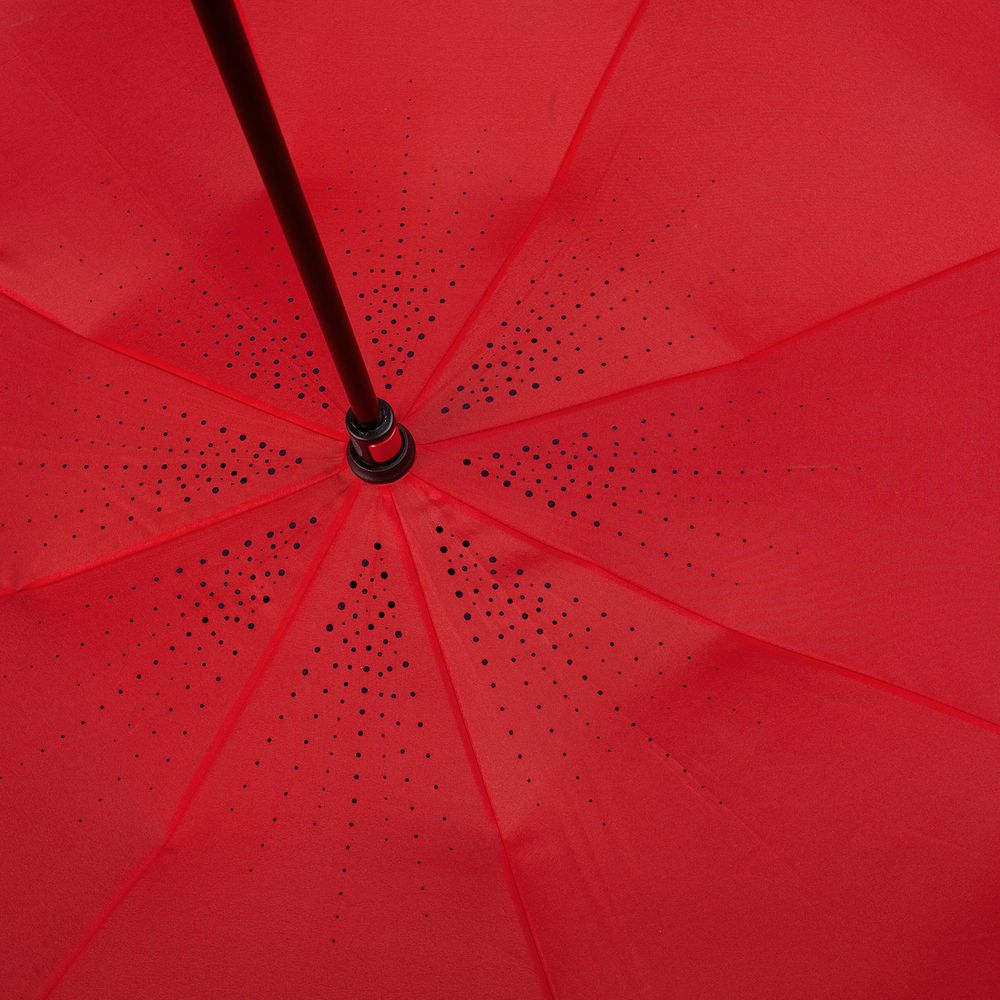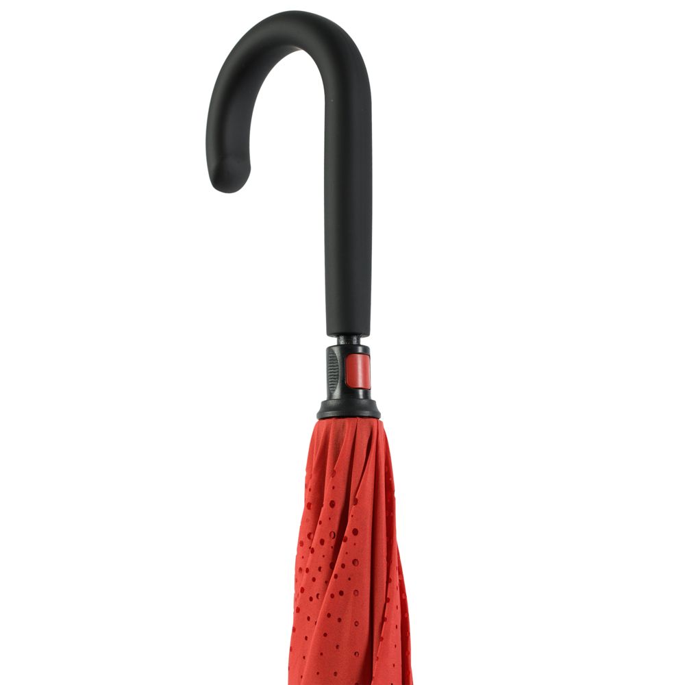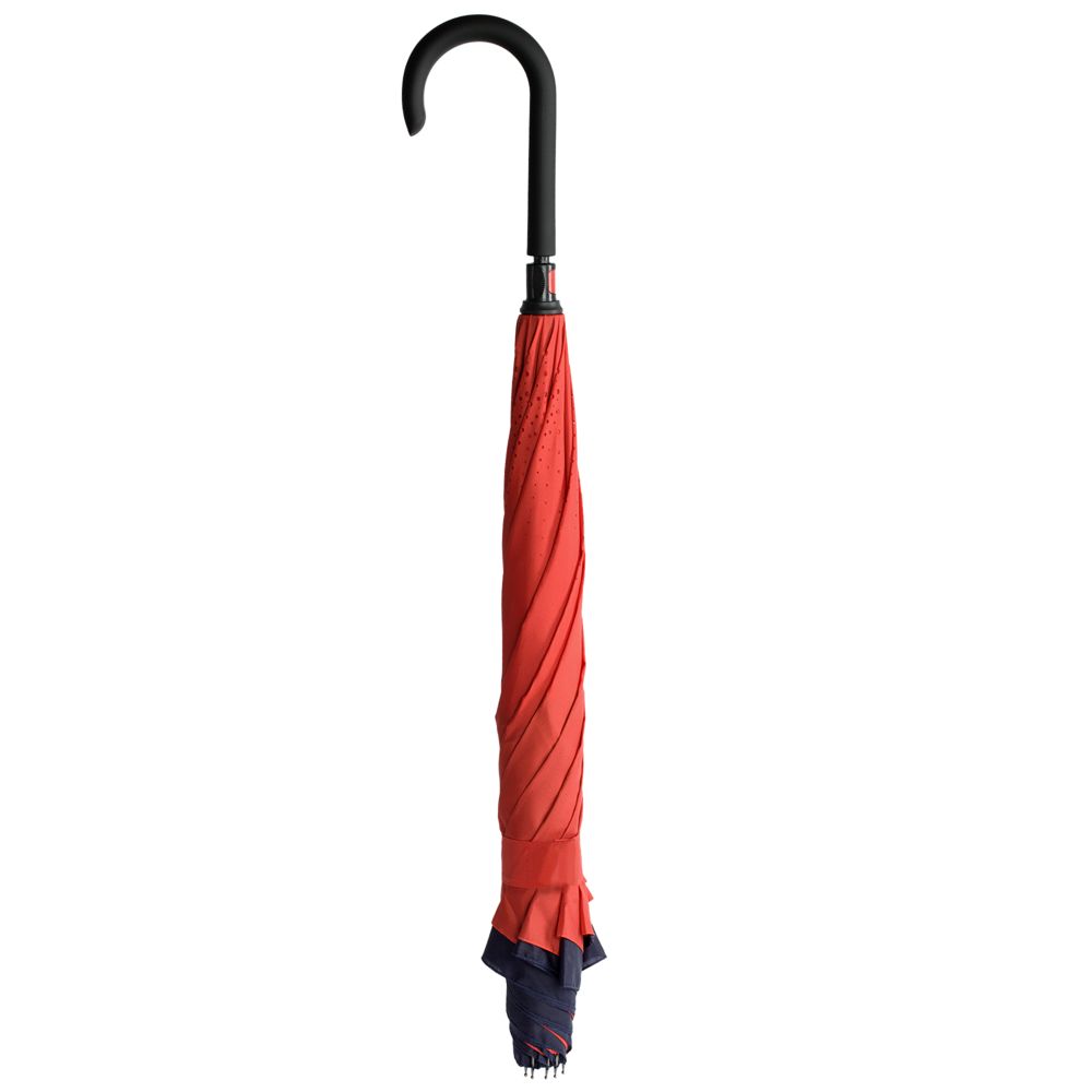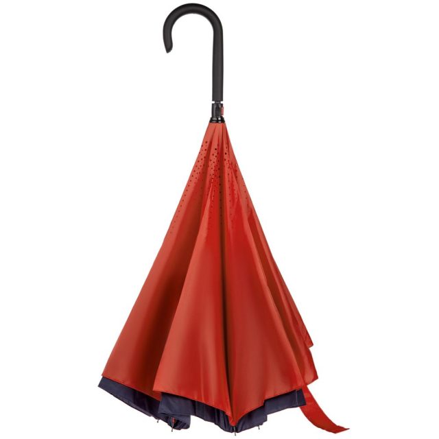 Это зонт-наоборот, зонт-наизнанку. Складываясь после дождя, он прячет мокрую поверхность в себя, а сухая остается снаружи. Для просушки его можно не только подвесить за ручку, как обычные зонты, но и поставить прямо на пол в полусложенном состоянии. Итог — мягкая щадящая просушка и минимум занятого мокрым зонтиком места.