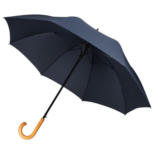 Элегантный зонт с большим куполом и деревянной J-образной ручкой.