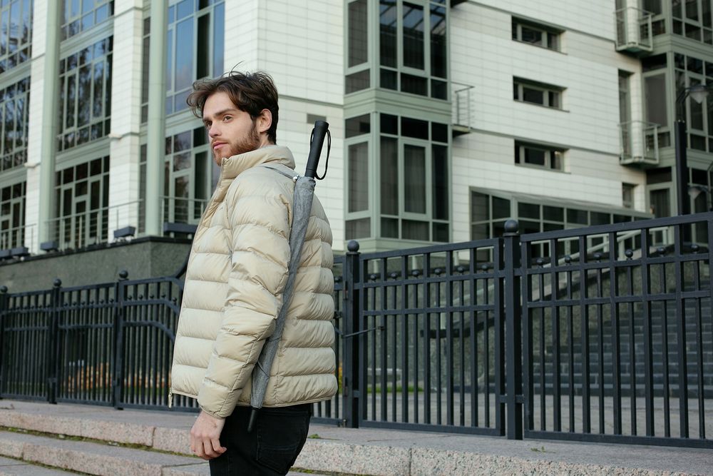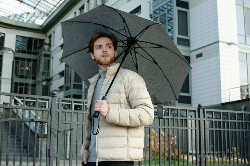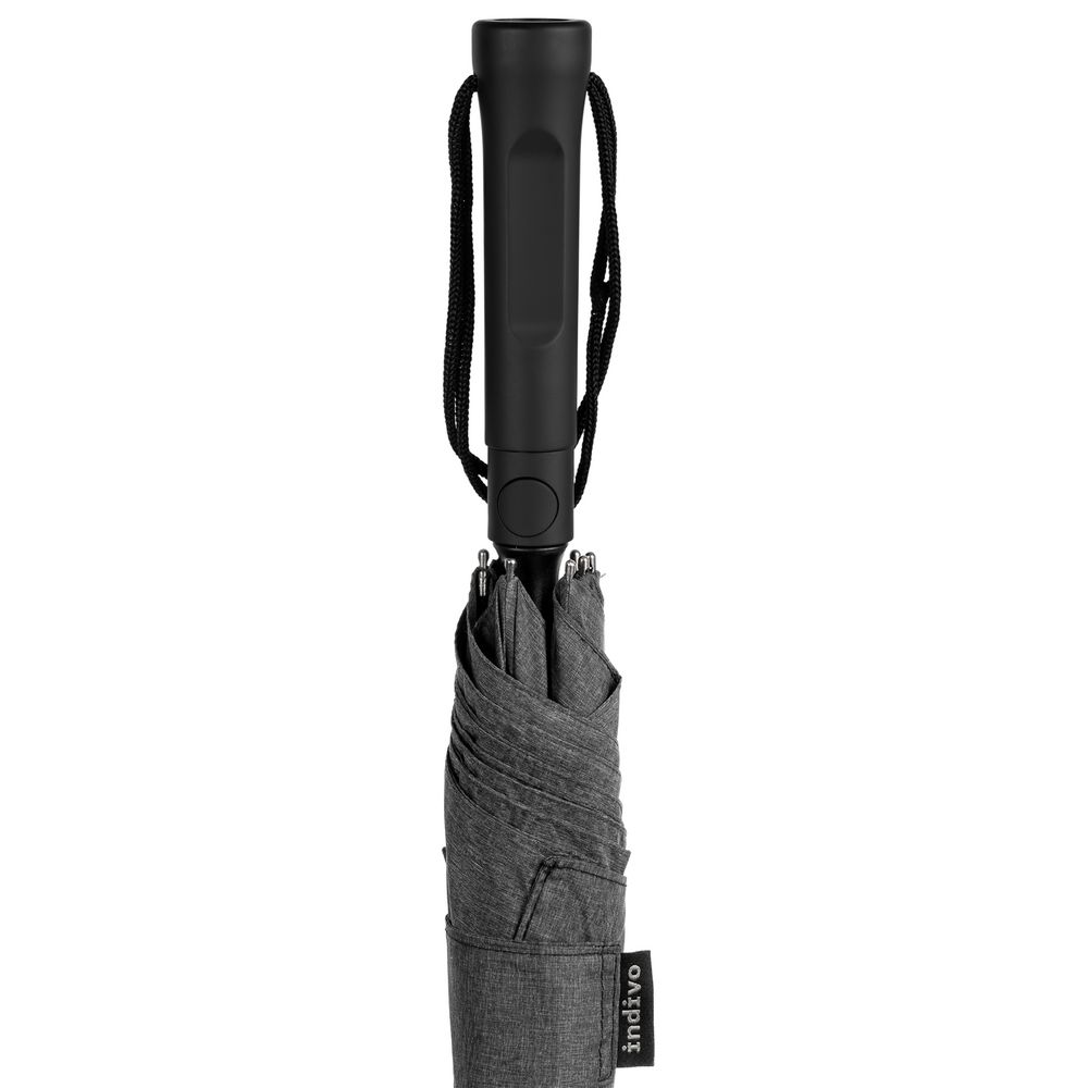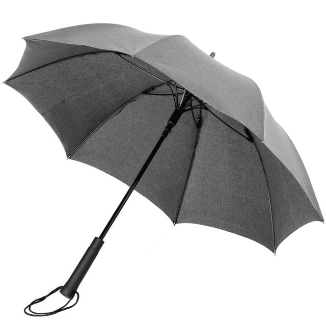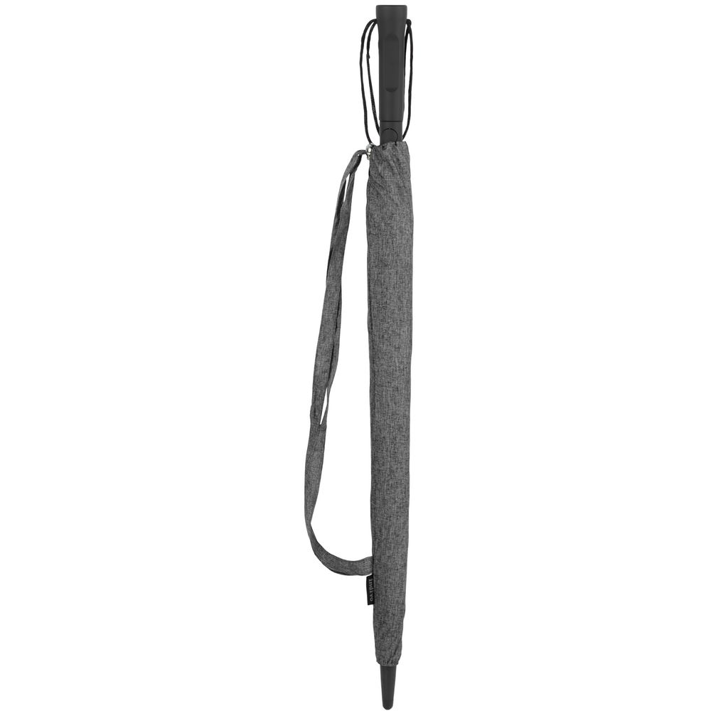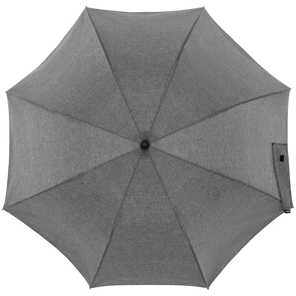 Зонт с куполом из меланжевой ткани уже достаточно необычен, но все еще вписывается в строгий дресс-код. Широкий хлястик трапециевидной формы предлагает достаточно места для нанесения логотипа.