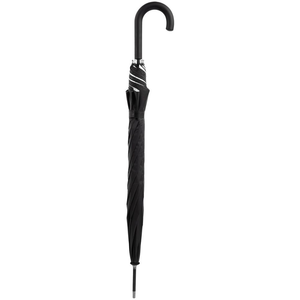 Легкий зонт-трость классической формы, который выглядит нескучно благодаря современным деталям исполнения — серебристому покрытию на внутренней части купола и мягкой прорезиненной ручке.